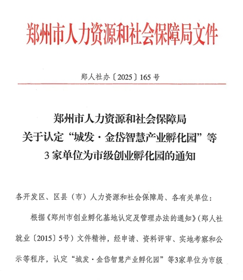近日,鄭州市人力資源和社會(huì)保障局發(fā)布關(guān)于認(rèn)定“城發(fā)·金岱智慧產(chǎn)業(yè)孵化園”等3家單位為市級(jí)創(chuàng)業(yè)孵化園的通知。根據(jù)《鄭州市創(chuàng)業(yè)孵化基地及管理辦法的通知》(鄭人社就業(yè)〔2015〕5號(hào))文件精神,經(jīng)申請(qǐng)、資料評(píng)審、實(shí)地考察和公示等程序,認(rèn)定“城發(fā)·金岱智慧產(chǎn)業(yè)孵化園”等3家單位為市級(jí)創(chuàng)業(yè)孵化園,并頒發(fā)鄭州市創(chuàng)業(yè)孵化園榮譽(yù)牌匾。